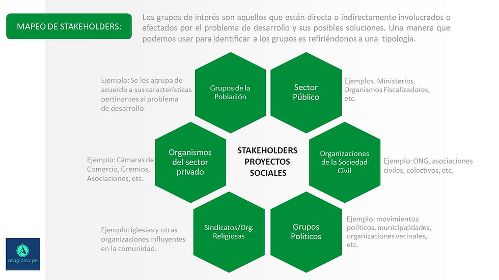 Antes de iniciar un proyecto -cual sea- es necesario el mapeo o identificación de los Grupos de Interés o Stakeholders, que es nada más y nada menos que un conjunto de personas o instituciones que se beneficiarán o resultarán afectados con la ejecución de un determinado proyecto.